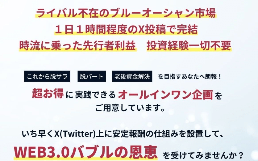 WEB3.0の波に乗り、先行者利益を掴むチャンス!専門知識不要、1万円で始められる「WEB3.0先行者利益完全攻略キット」でX(Twitter)情報発信ビジネスをスタート。高単価アフィリエイトで月収アップを目指しませんか? -